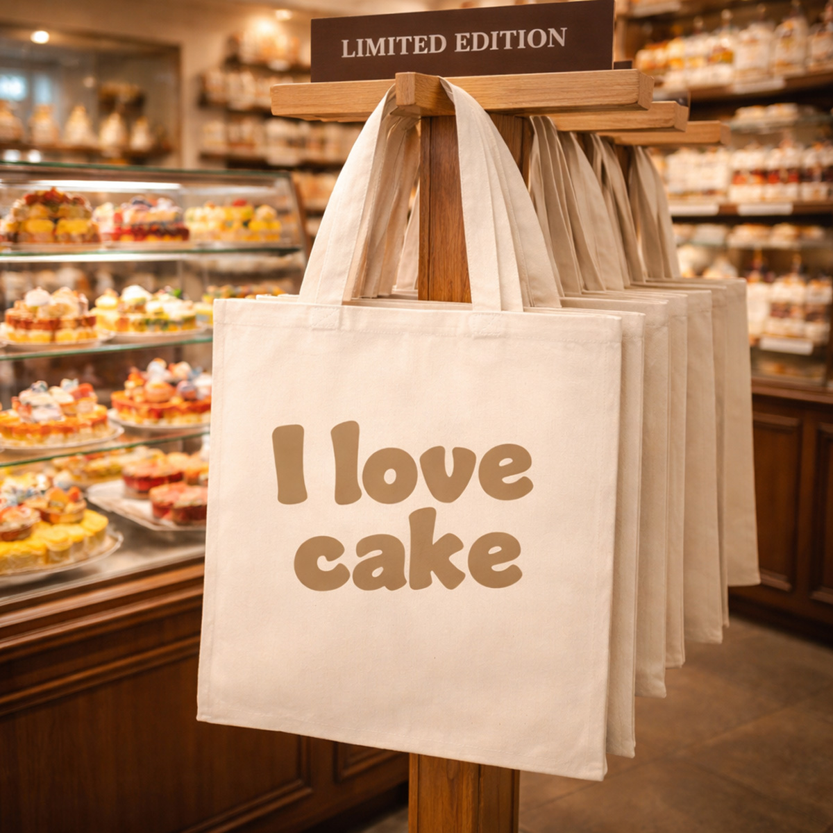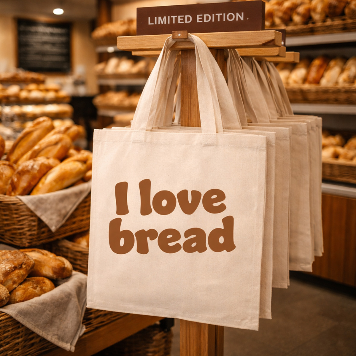 De nieuwe lijn bestaat uit drie varianten met elk een eigen foodthema: I Love Chocolate, I Love Bread en I Love Cake. Samen vormen zij een samenhangende collectie die perfect aansluit bij verschillende specialismen binnen de foodretail. De combinatie van naturel katoen en een duidelijke opdruk zorgt voor een uitstraling die direct past bij ambachtelijke producten en speciaalzaken waar beleving en kwaliteit centraal staan.