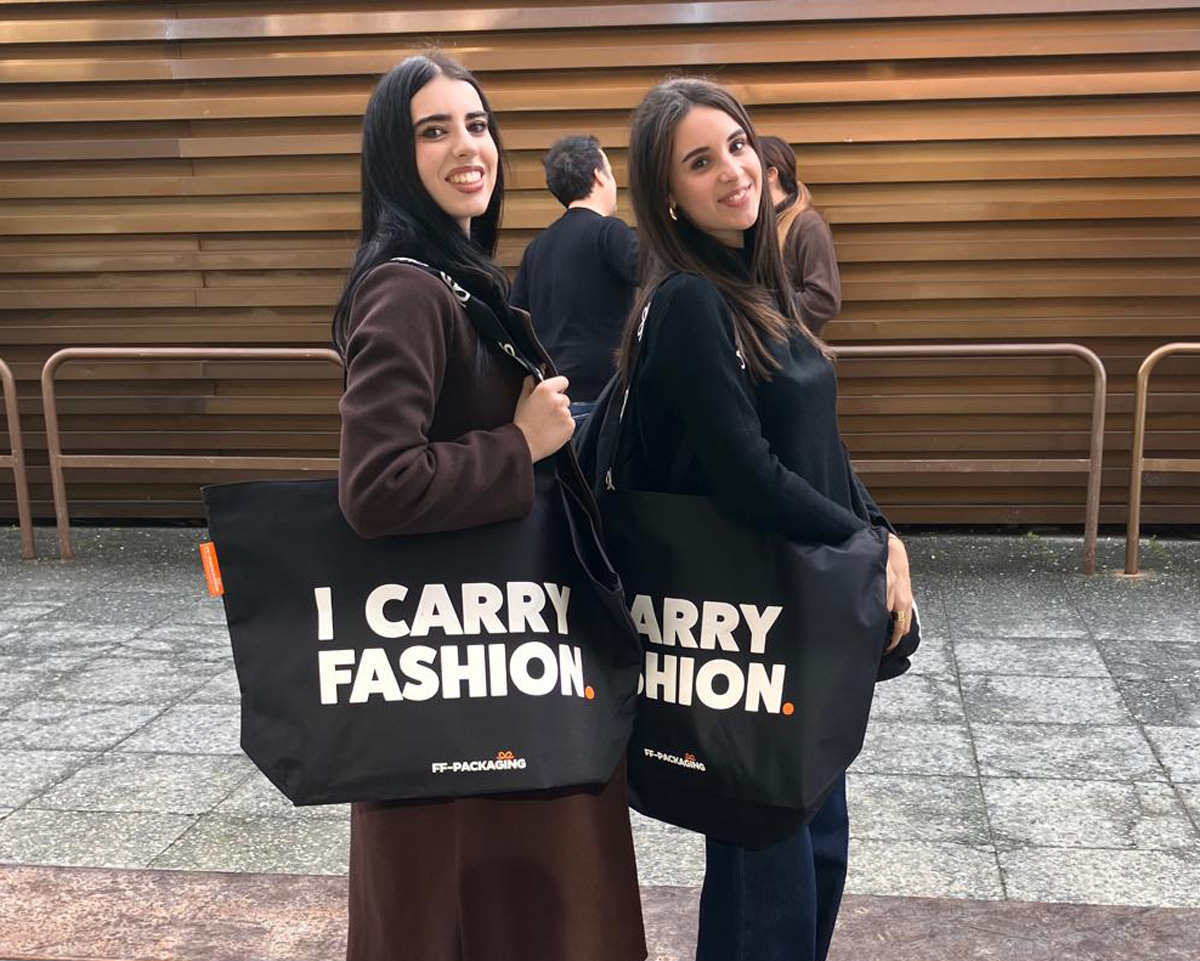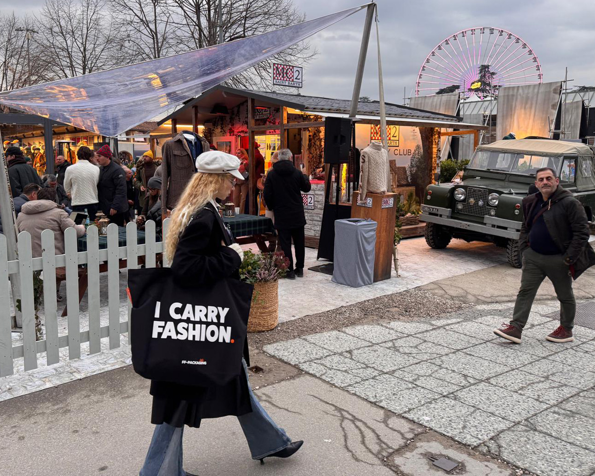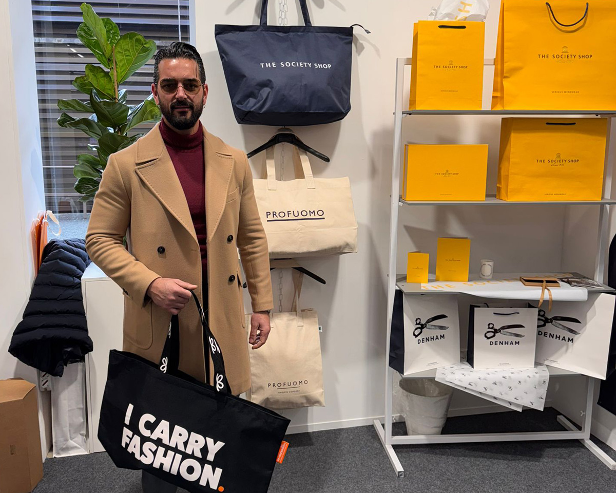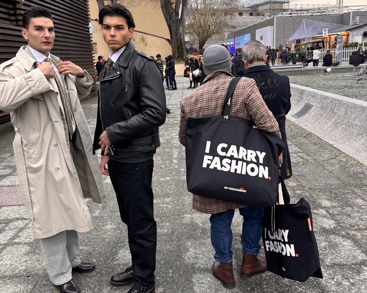 Een opvallend item tijdens de beurs waren onze XXL shoppers voorzien van de krachtige opdruk I CARRY FASHION. Deze shoppers werden volop uitgedeeld en enthousiast gebruikt door bezoekers. Naarmate de beurs vorderde, waren ze overal op Pitti Uomo te zien. Dit zorgde voor herkenbaarheid, zichtbaarheid en een natuurlijk startpunt voor gesprekken en nieuwe ontmoetingen. Een mooi voorbeeld van hoe een goed doordachte verpakking direct bijdraagt aan merkbeleving en interactie.